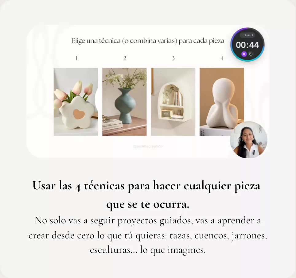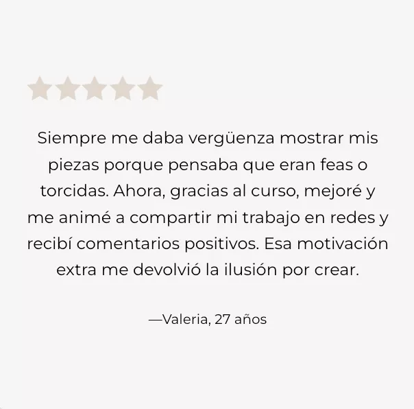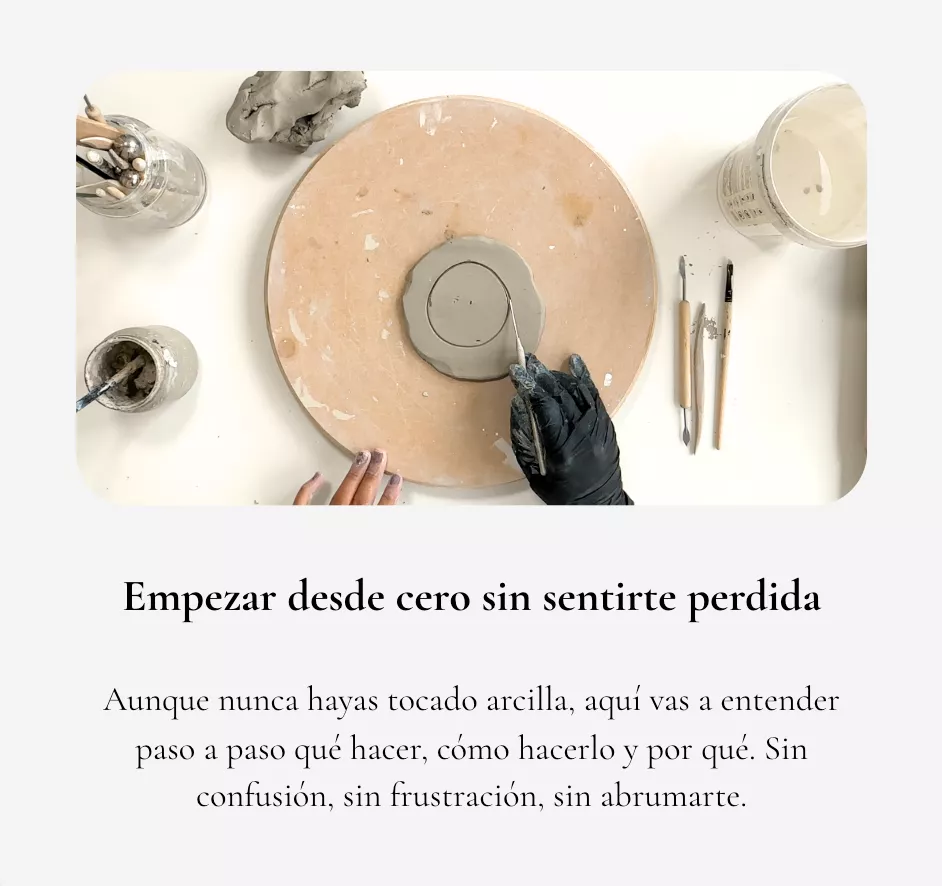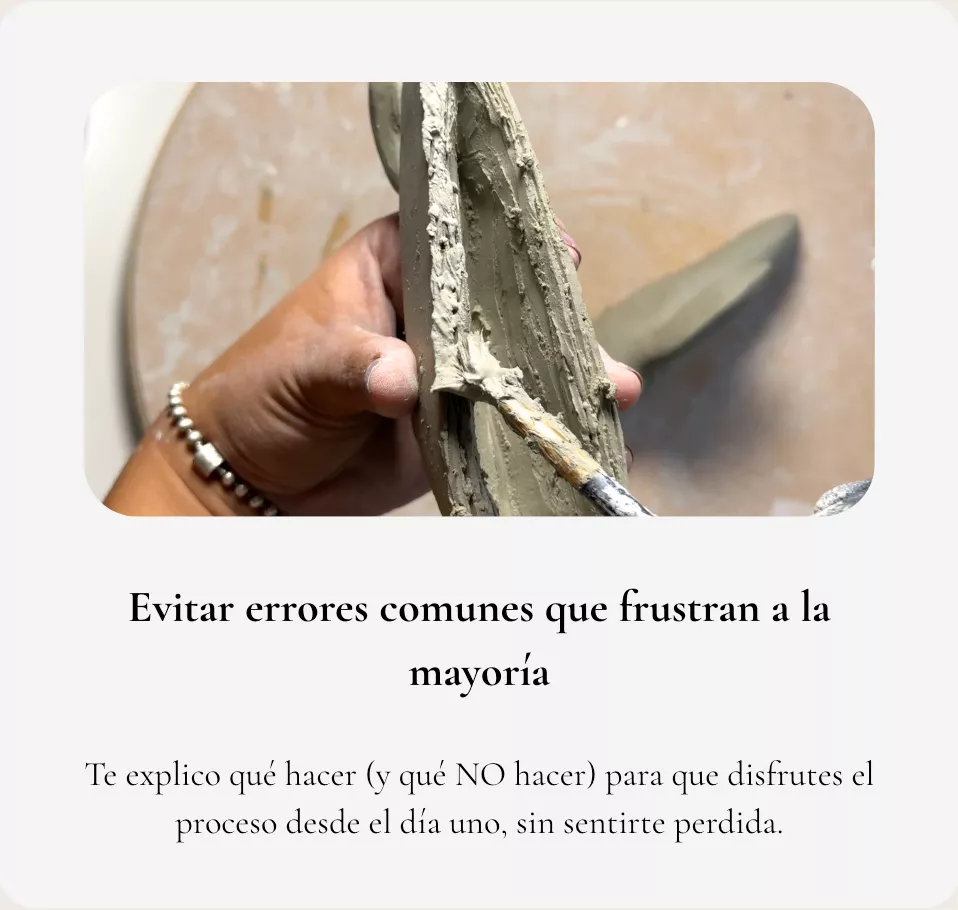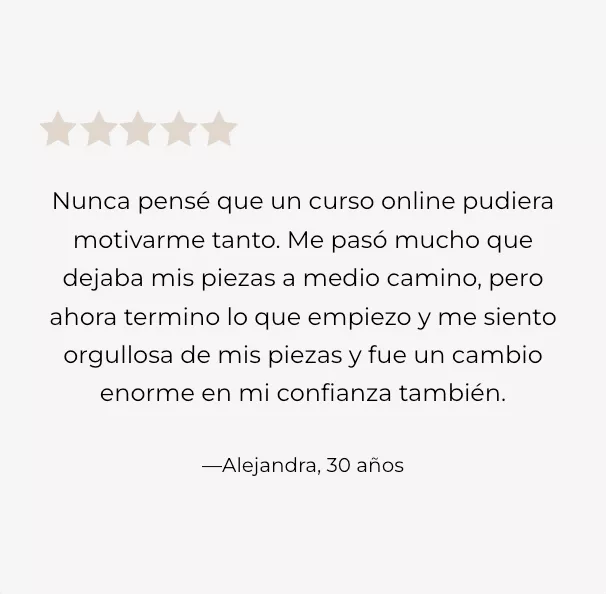 Si el perfeccionismo y la falta de conocimiento te detienen, estás en el lugar indicado. Mi curso online está diseñado para empoderarte y desbloquear tu potencial creativo. Aprenderás todo lo necesario para crear piezas hermosas sin frustraciones. No más dudas, solo claridad y acción en tu viaje artístico.