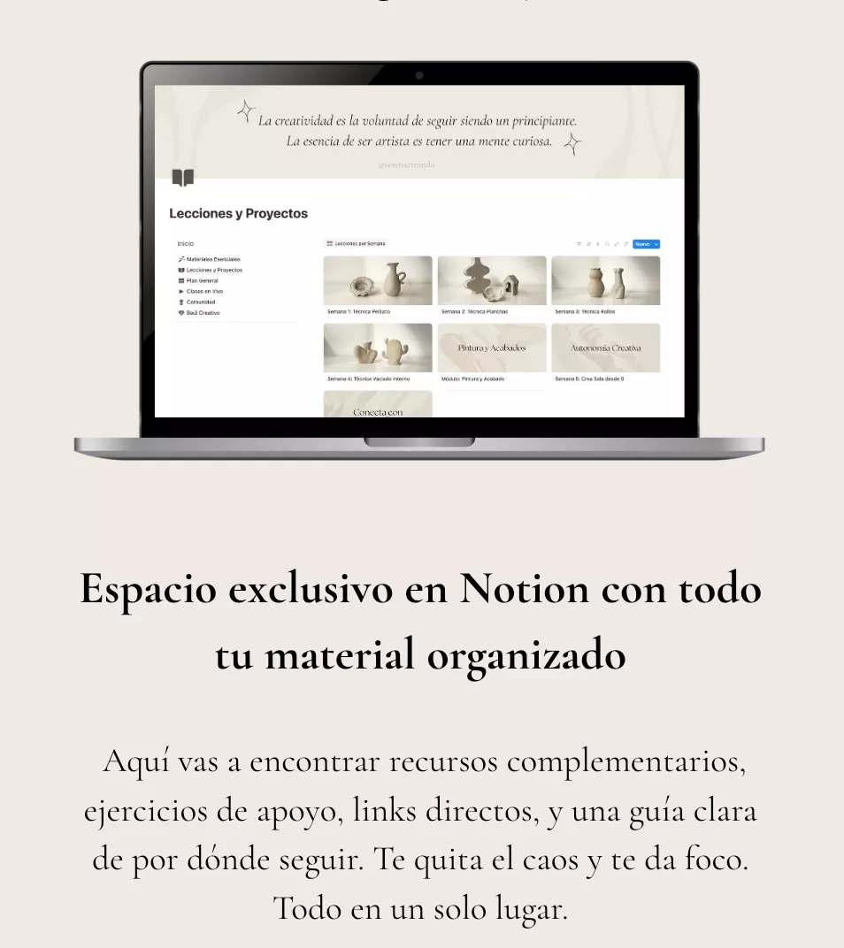 Recibirás una plantilla completa en Notion para organizar tu proceso: materiales, progreso, calendario, piezas creadas y más.