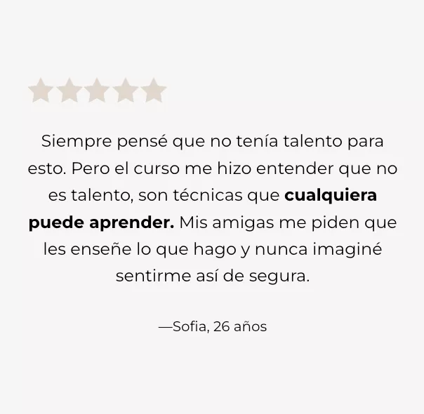 Aplicarás todo lo aprendido con autonomía. Sabrás elegir la técnica correcta, analizar cualquier pieza y resolver errores como una verdadera artista con criterio propio.