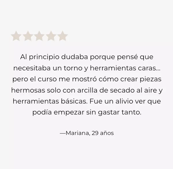 Inicias con la técnica del pellizco: simple, ancestral y poderosa. Crearás tus primeras piezas desde cero, soltarás el miedo a equivocarte y empezarás a construir confianza en tu capacidad creativa.